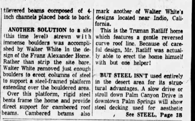 Sources include: The Walter S. White papers at UC Santa Barbara, Volker Welter, Walter S. White: Inventions in Mid-Century Architecture.