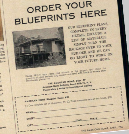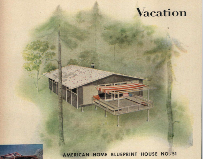 1955 – The American Home Magazine Weekend House. Designed as “Blueprint House #51” and published in the April 1956 issue. Built by Darrell Huff and Paul Corey, frequent contributors to the magazine’s how-to projects. Photos are from the house they built. Likely located in New York. Status unknown.