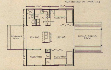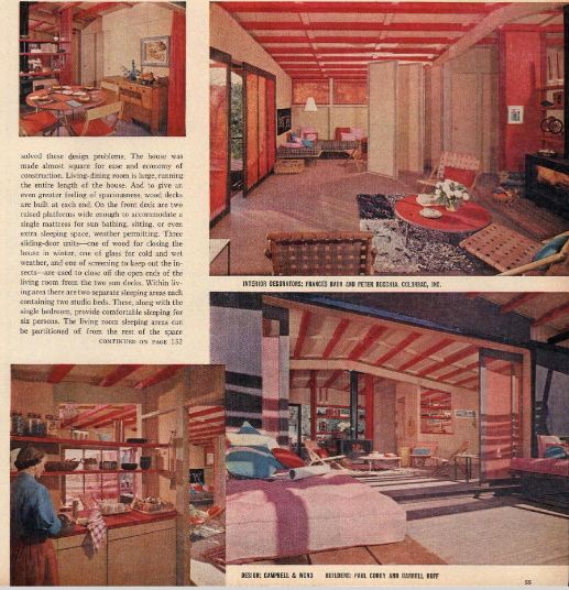 Of Campbell and Wong's design, the magazine wrote: "The 12'-by-19'9" combination room has lots of glass, a view of the back play court, a fireplace and plenty of space for family dining and parties. The plan permits a small but cozy and quiet living room for parents. When the third bedroom is added, parents will have even further privacy because it is built at the rear of the garage, in close relationship to the adult part of the house. The house is divided into two wings, one for living, one for sleeping. They are connected by an entrance hall and a play court, and from the entrance hall there is direct access to every room. Exterior walls of the house are textured plywood; interior finish, dry wall panels; floor, concrete." (See "Good Houses for $10,000 of Less: House with a Living Kitchen for $9,000," Woman's Day, vol 22, no. 9, 6/1959, p. 25.)