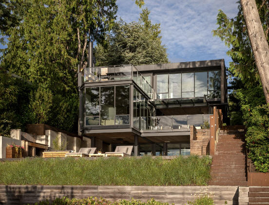 2008 - The Shawn and Sherrie Parry Residence, aka the Mercer Island Residence, 8320 Avalon Drive, Mercer Island WA. Commissioned in 2007. 8000 sf. Photos by Tim Bies. Project architect, Elizabeth Bianchi Conklin. Sold in 2021 to Yibo Ling and Lan Xuezhzo. For sale in 2025.