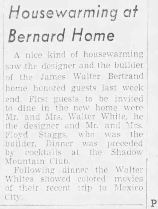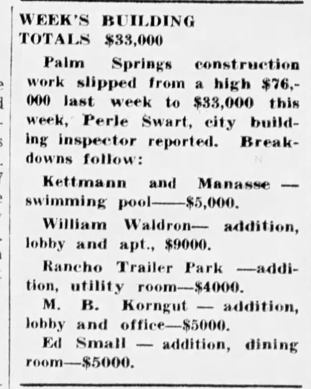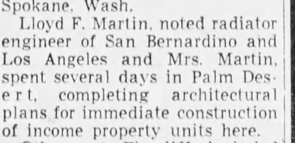 1949 - The Lloyd F. Martin Apartments, Palm Desert CA. Only mention of his name in the papers is this snippet from Jan. 1949. Status unknown.