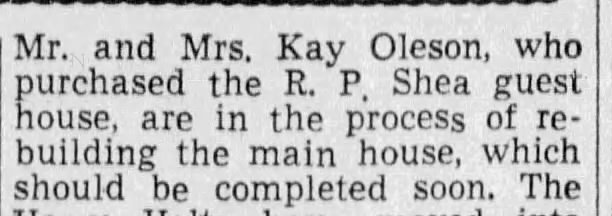 1949-1950 - The R. P. Shea House at 73-371 Pinyon Street, Palm Desert, California. Sold in 1950 to Kay Oleson. An August 1950 article documents that she lived in the property’s guest house while rebuilding the main residence. Property records indicate a renovation in 1951. The house retains the same footprint visible in a 1954 aerial photograph, the earliest known aerial image of the property. The home remains in the Oleson family and is owned by the son, Gary Oleson.