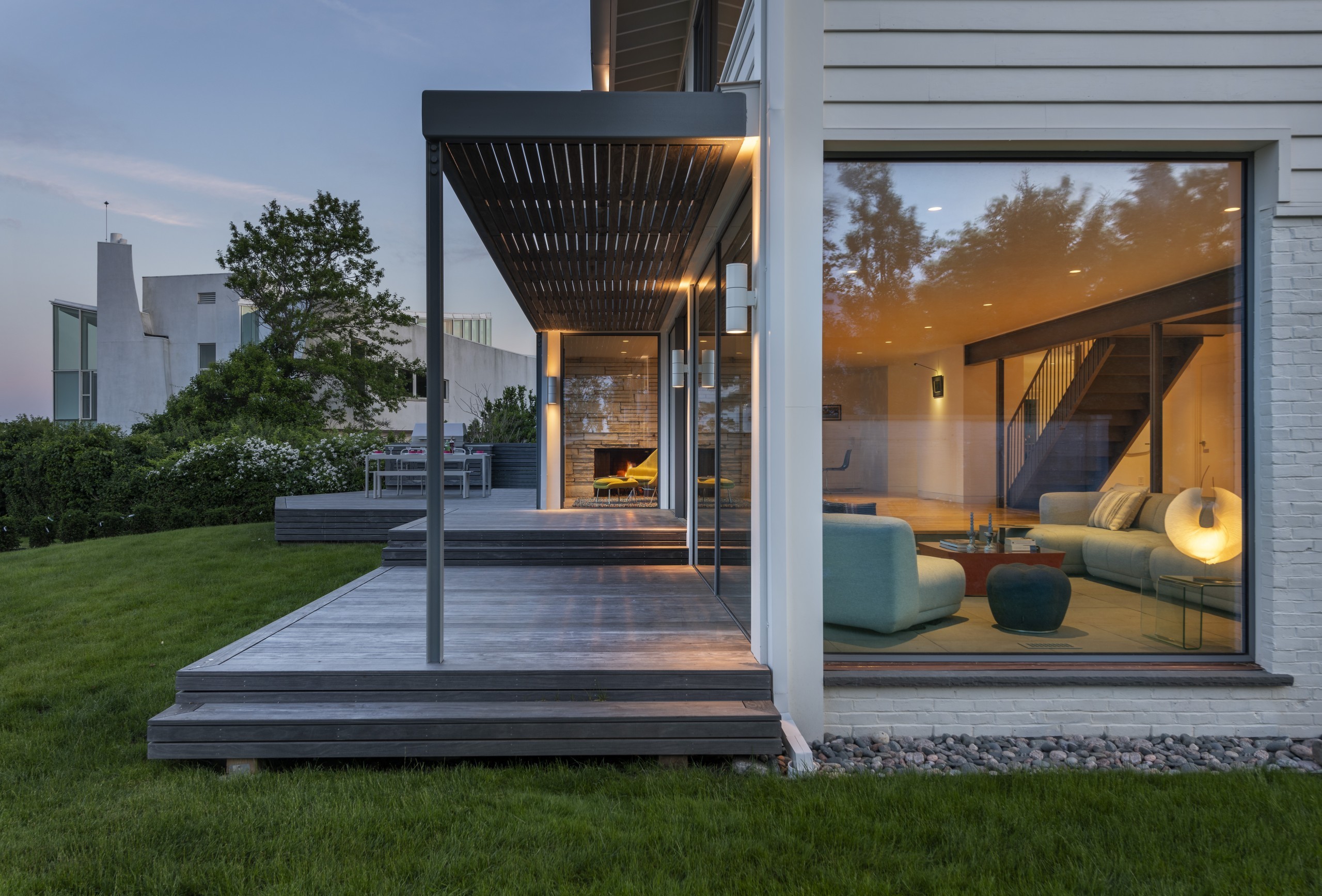 The original house was basic in design, with a fair amount of glass facing the water. Flavin and Siegel replaced much of it with a floor-to-ceiling sliding window system from Portugal called “panorama!” plus Loewen windows upstairs. They removed the main interior wall except near the stone fireplace, keeping the original floor plan intact.