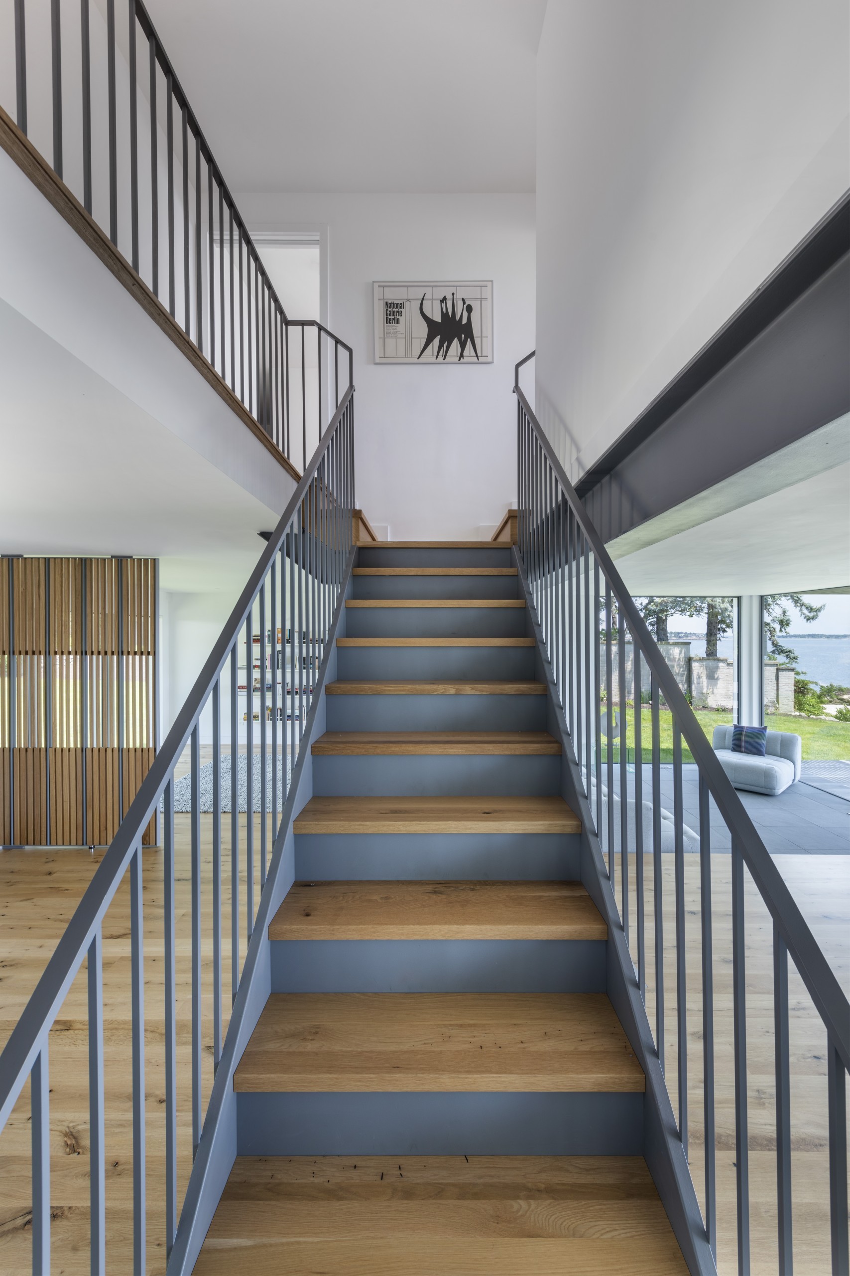 Siegel’s efforts are invisible but highly effective. The structural engineer left a short section of solid wall between the glass sliders and inserted a steel column inside it, securing the building foundation at grade and to a steel beam bolted atop. Physically, it maximizes the amount of glass and minimizes the visibility of structural steel. “It’s a delicate dance,” Siegel says. “That’s a celebration of the design style of Flavin.”