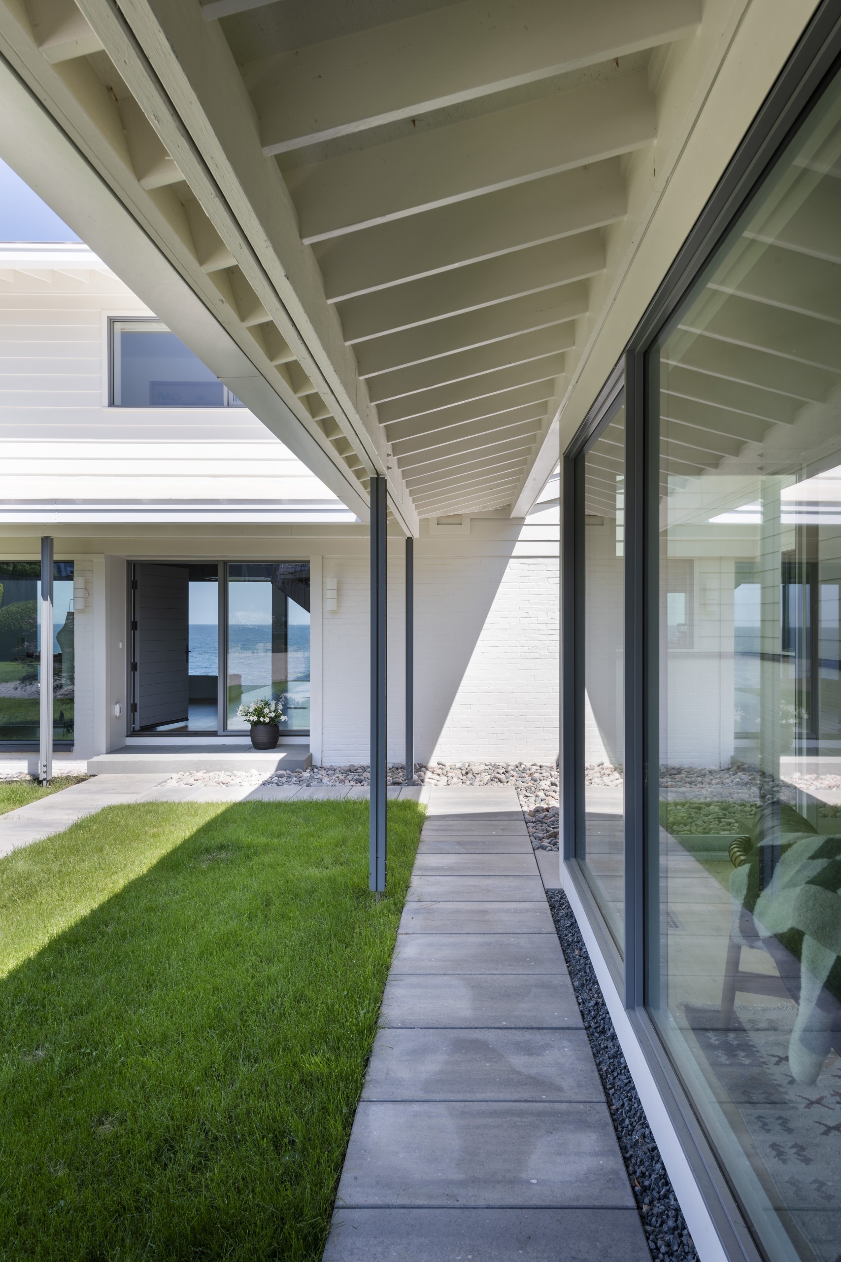 “We opened it up to the view side but retained the brick side on the opposite elevation,” he says. “There’s opacity on the street side and transparency out to the ocean.”