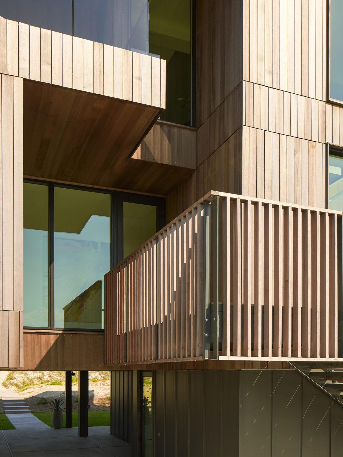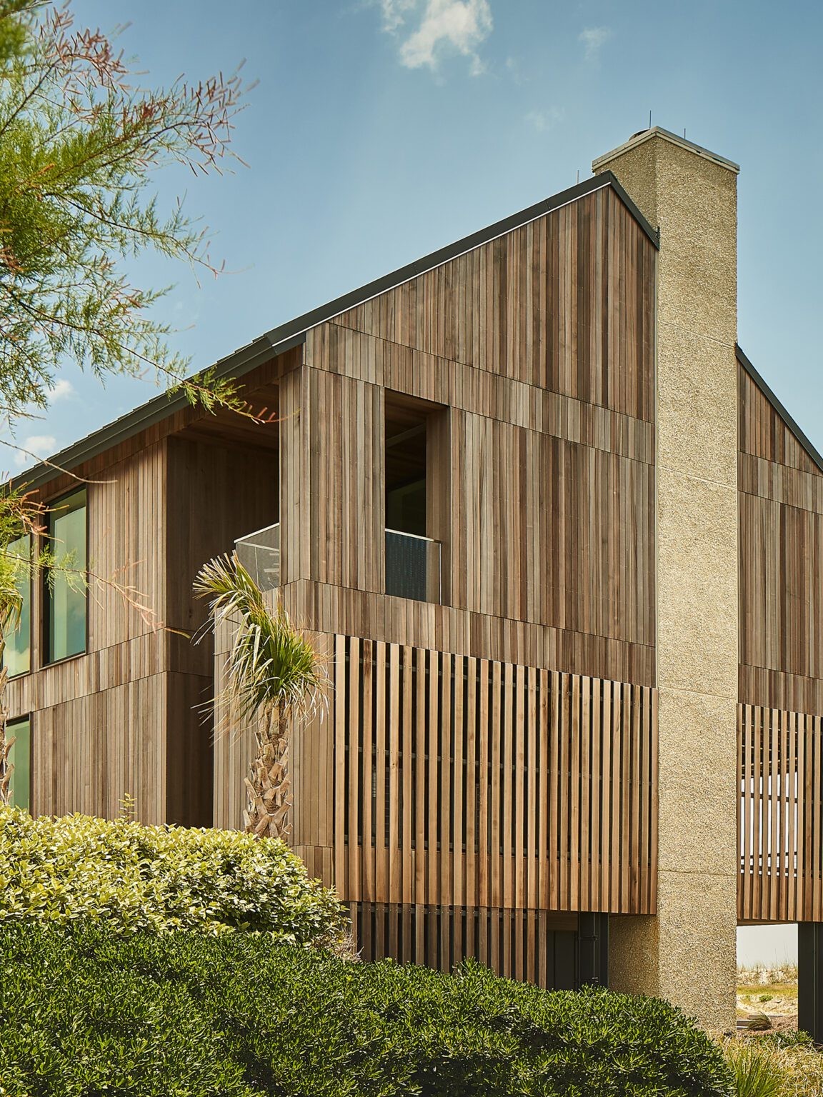 The architects’ material palette respected the island’s precedents. The home is clad in vertical cedar siding that’s durable, renewable, and ready to weather and integrate with surrounding reeds and palms.