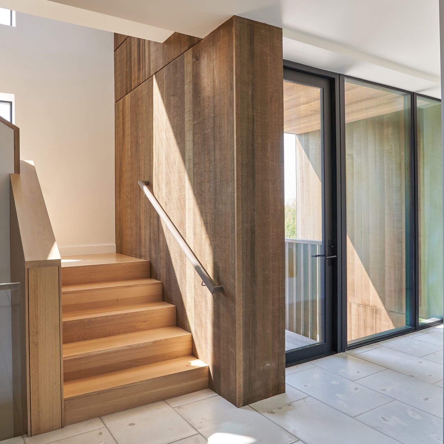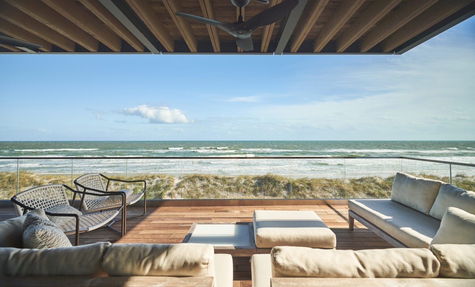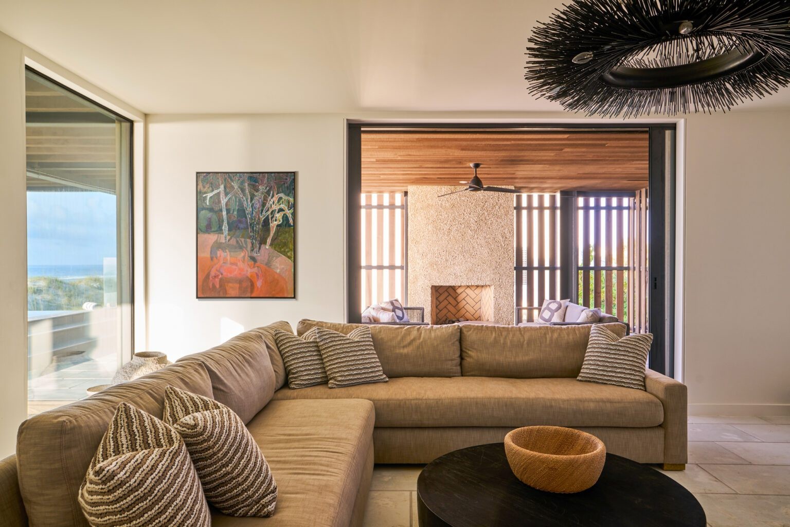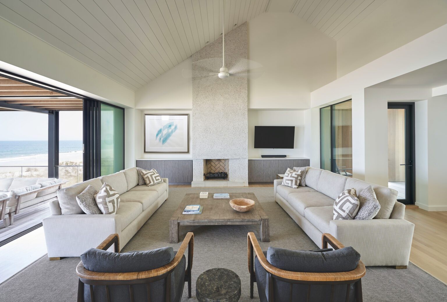 Everything above is organized to take maximum advantage of ocean vistas. The main living areas, kitchen, and primary suite are on the third level. Three more bedrooms and children’s gathering spots are on the second.
