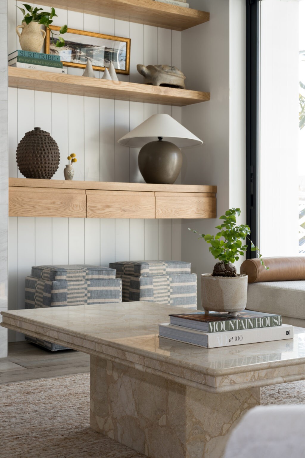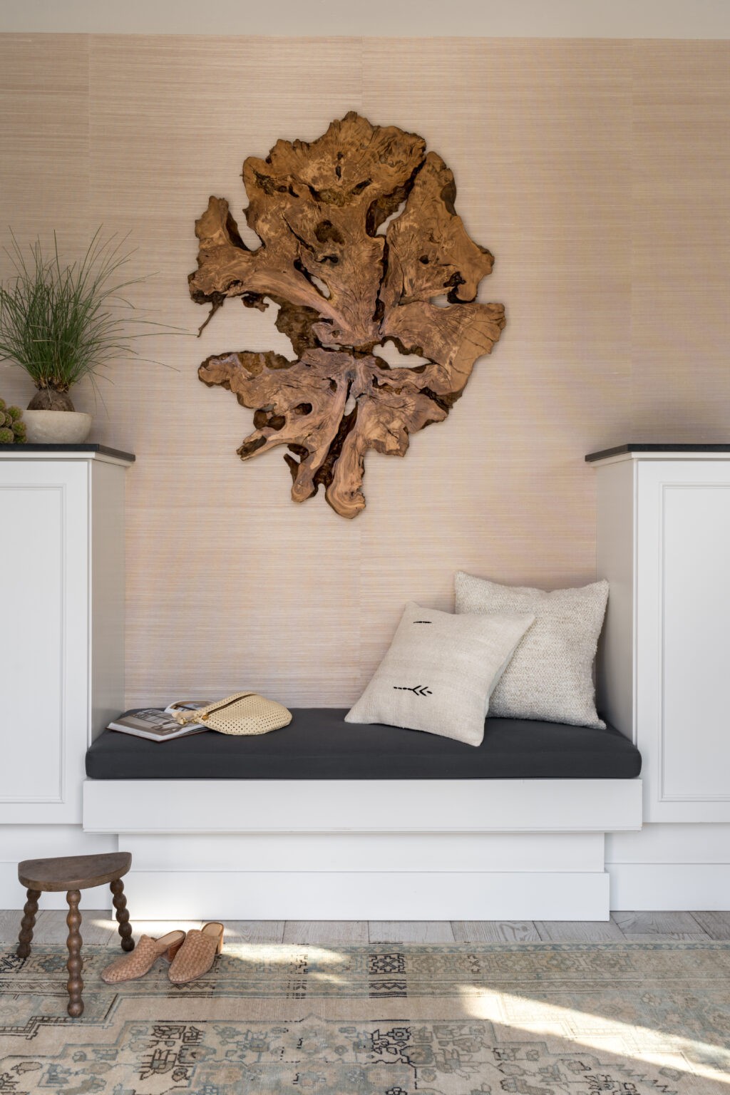 That starts at a transparent front door – a huge, pivoting piece of glass. Inside the foyer a three-foot-by-four-foot section of a Turkish olive tree is wall-mounted. It’s a hundred years old and hand selected from photos. “We shipped it in raw and put a marine-grade, clear matte finish on it,” Harvey details. “It’s coastal and worldly – they cut through a big piece of the root and sent it to us.”