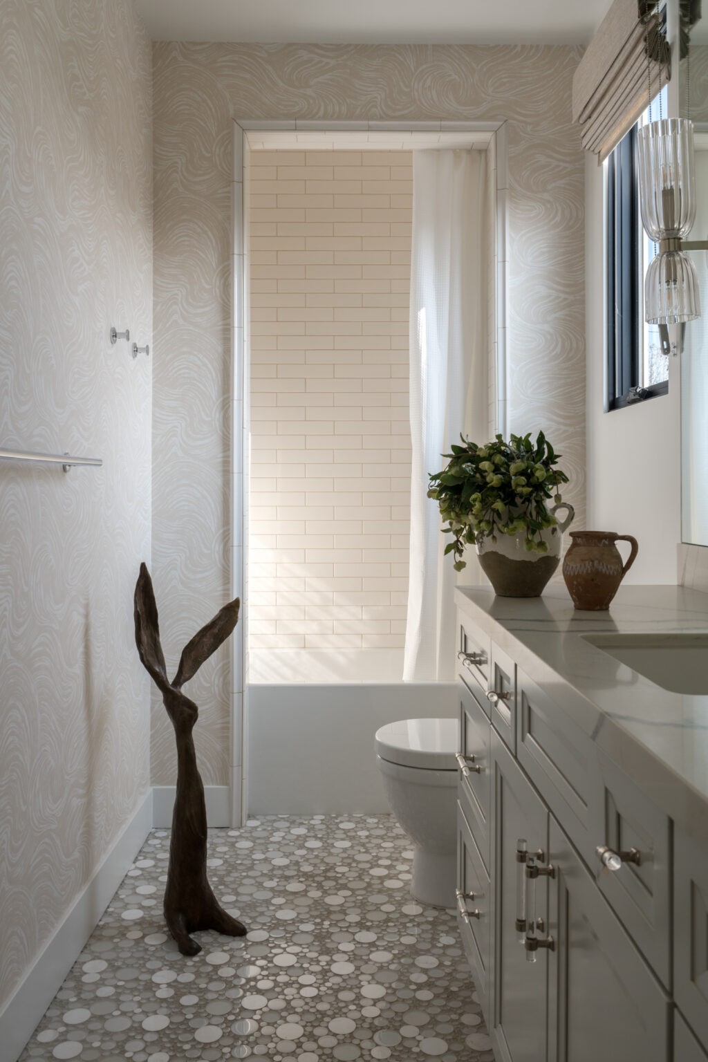 More whimsical but still warm was the clients’ existing sculpture that she placed in a bathroom, a piece known as the bronze bunny. “It’s such an odd and unexpected object,” Harvey says. “And placing it in the bathroom just amplified the mystery and the playful storytelling vibe it brings.”