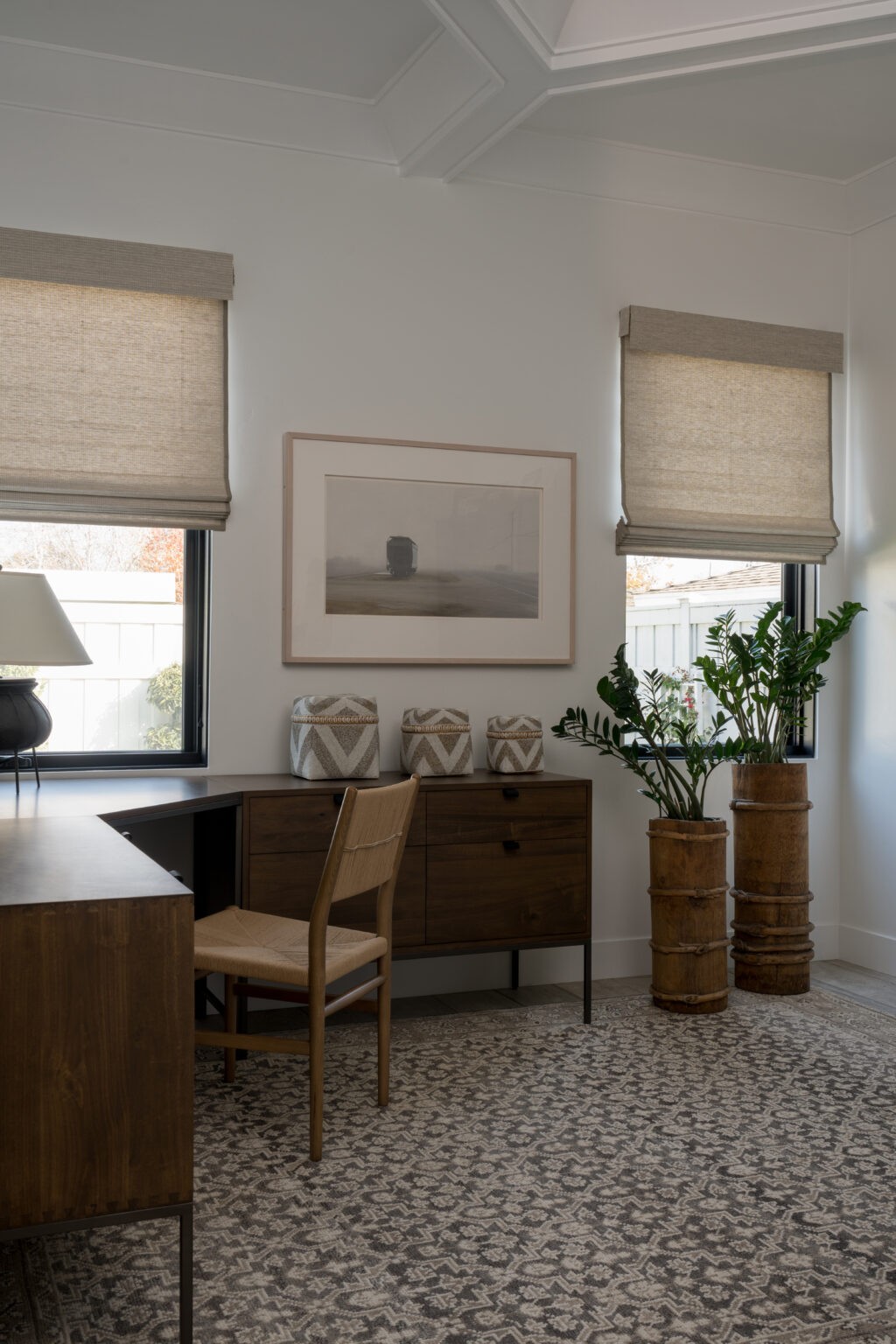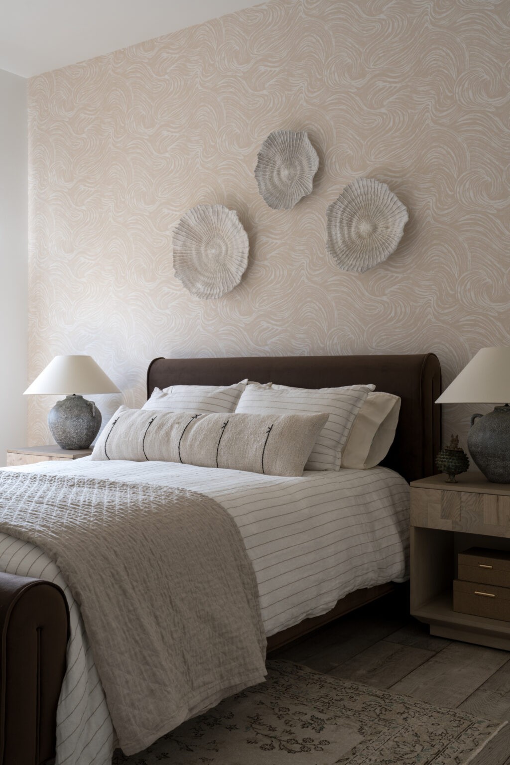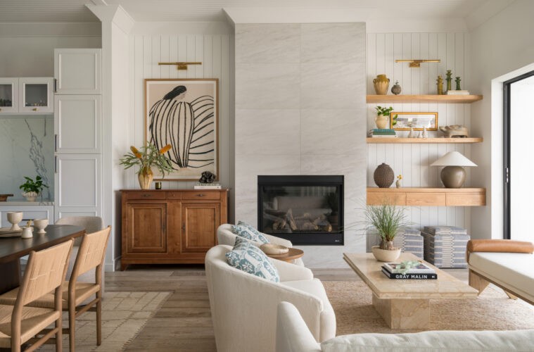 Her clients are more attracted to a California Casual look, with a woody warmth. “We didn’t do a lot of renovation but added white oak shelves beside the fireplace and wallpaper in the bedrooms,” Harvey says