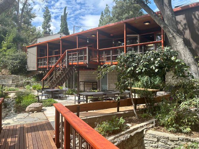 1959- The Paul S. and Louise H. Veneklasen House Addition, 2179 Mandeville Canyon Road, Los Angeles CA. House was originally designed by architect Kenneth Lind in 1951. Koenig put a significant mark on the structure, most notably the living room with its distinctive accordion-fold glass wall. Architect Josef Van der Kar designed an addition for owner Fred Hoffman in 1961. Sold in 2018 to Olive Ohara Properties LLC. Sold in 2021 to Piedmont Trust. Chu-Gooding Architects, executed a masterful restoration and expansion plan, for which it won the 2022 AIA LA Award for historic preservation. Interiors published in Architectural Digest (July 6, 2022). For sale in 2025. Text and photos by Michael Locke.