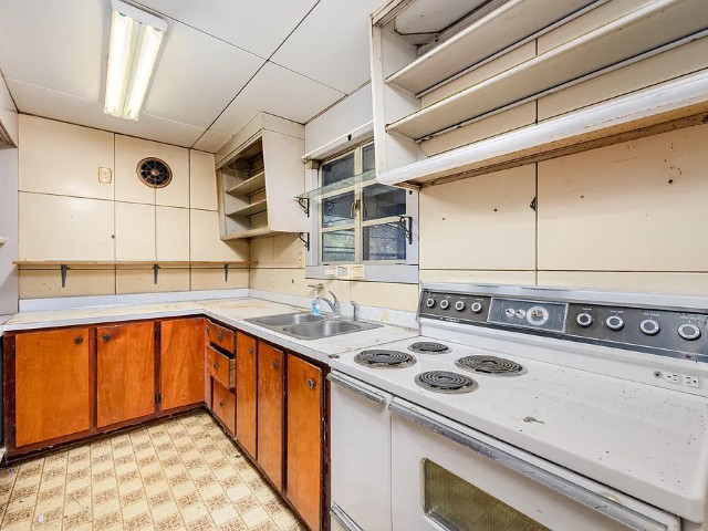 Description: Kitchen remodeled, wood shelves added, passthrough removed. Bathtub removed, walk-in shower added.